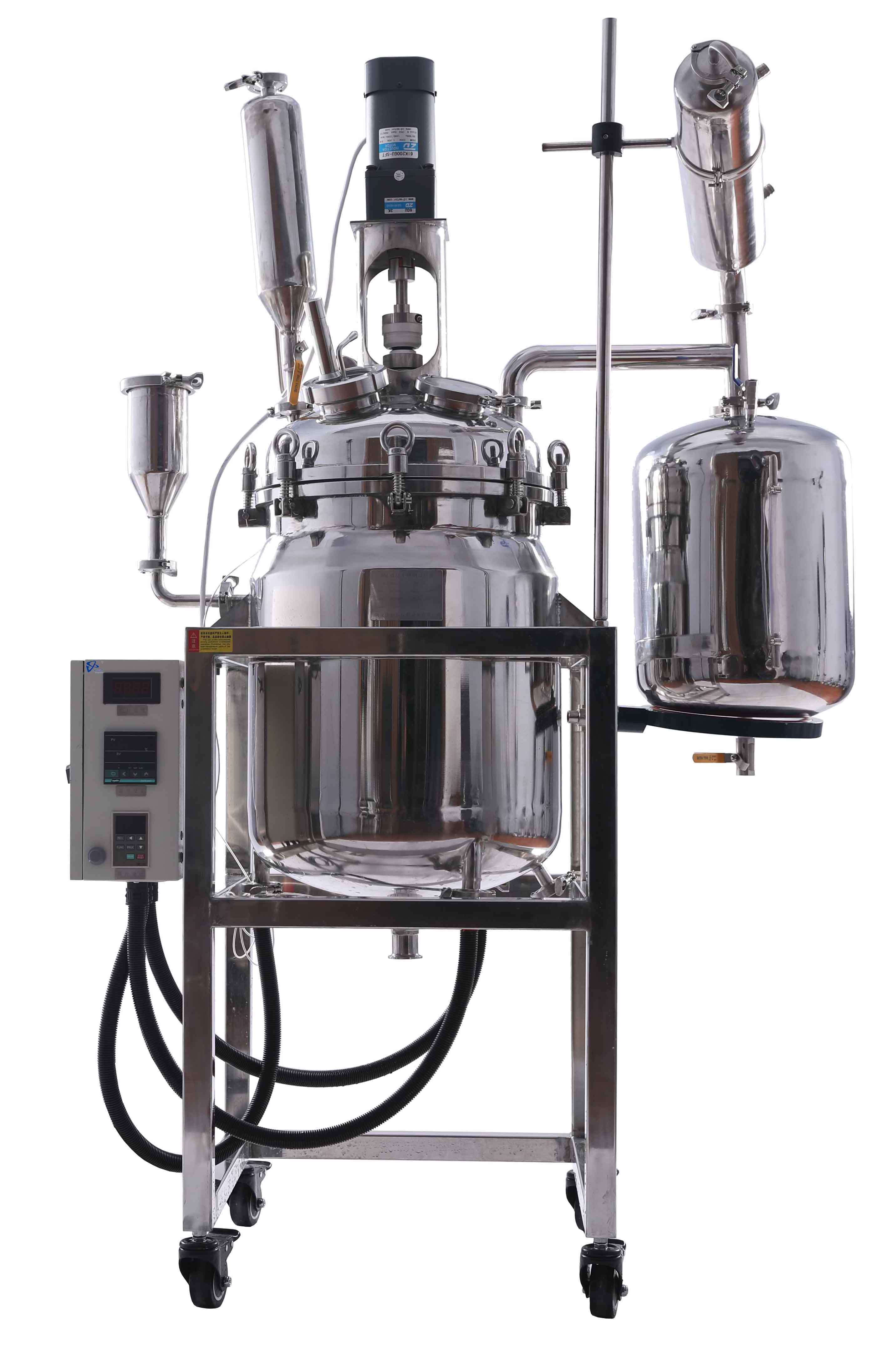 雙層不銹鋼反應(yīng)釜為雙層不銹鋼設(shè)計,內(nèi)層放入反應(yīng)溶媒可做攪拌反應(yīng),夾層可通上不同的冷熱源(冷凍液,熱水或熱油)做循環(huán)加熱或冷卻反應(yīng)。在設(shè)定恒溫條件下,在密閉的不銹鋼反應(yīng)器內(nèi),可根據(jù)使用要求在常壓或負(fù)壓條件下進(jìn)行攪拌反應(yīng),并能做反應(yīng)溶液的回流與蒸餾,是現(xiàn)代精細(xì)化工廠、生物制藥和新材料合成的理想中試、生產(chǎn)設(shè)備。