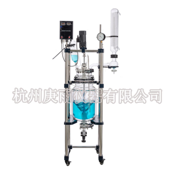 本機(jī)具有電動(dòng)恒速攪拌系統(tǒng)、冷凝、滴加系統(tǒng),釜體夾層需外接加熱或制冷的循環(huán)設(shè)備。在攪拌物料的同時(shí),通過(guò)夾層注入循環(huán)的熱溶液或冷卻液,對(duì)釜內(nèi)的物料進(jìn)行恒溫的加熱或制冷。物料進(jìn)行加熱反應(yīng)時(shí),在真空條件下可以提高蒸發(fā)效率(需連接真空裝置),溶媒蒸汽經(jīng)玻璃冷凝盤(pán)管時(shí)冷卻成液體(需連接冷卻裝置),可回流到釜內(nèi),也可通過(guò)回流彎頭下部閥門(mén)進(jìn)行回收。反應(yīng)完畢,物料可從釜底的側(cè)出料口放出。