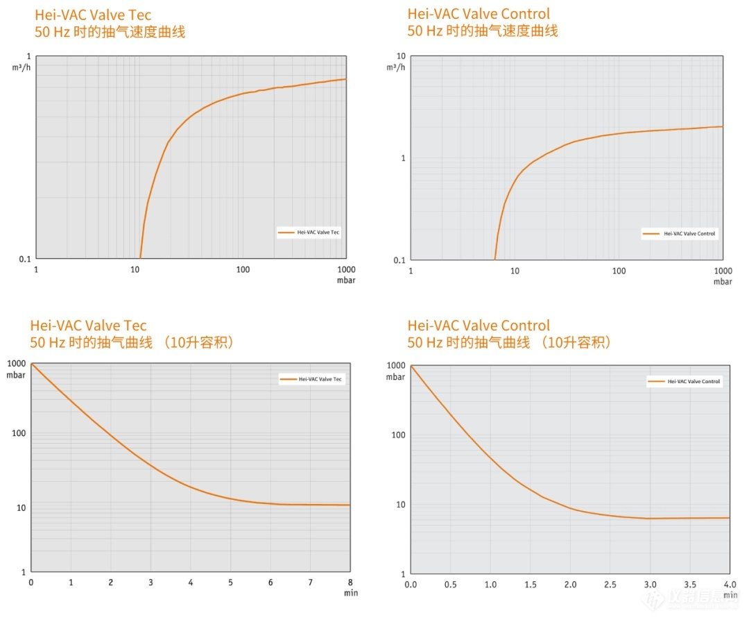 可以從上圖看出,真空泵運行一段時間后,在相同真空度情況下,hei-vac valve control的抽氣速率高于hei-vac valve tec,hei-vac valve control的能效更高。